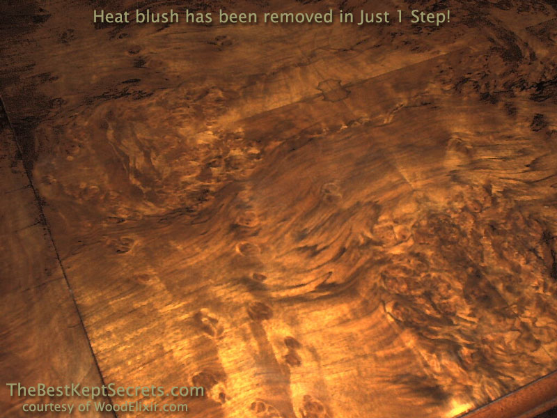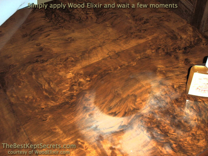 Ever had a table damaged by a hot plate or pizza box? This beautiful burl walnut table is suffering from "heat blush", the white haze caused by heat and the resulting moisture being trapped in the finish (photo 1). By simply pouring on a small amount of Wood Elixir, waiting a few moments, then wiping off, you can see the heat blush being removed (photo 2). Just pennies worth of Wood Elixir removed the heat blush, restoring this antique treasure to it's original beauty (photo 3).